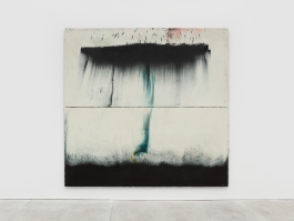 Andreas Reiter Raabe makes painting and sculpture that arrives out off a sort of hands-off process. With the machinery of production existing somewhere between the artist and the result, Reiter Raabe allows, somehow apparently with little emotion, the paint to fall on the canvas in smears, blops and plops. The sifting process which has already taken the mark away from the hand uses a touch that in its own terms neither succeeds nor fails, but that is, to a certain extent, determined by a language that surrounds the success and failure of abstract painting. It is also one that can be judged by different criteria. Is this a ‘good one’, both artist and expectant observer enquire, is it lovely, what does that mean? Reiter Raabe’s process mimics the early days of a printing press; the production of and laying out of written and visual language that is neither basic nor primary, but in this case with a palette that looks if it has already been mixed in another life. The machinery of production in turn mimics a cottage industry of constructed rationale where paint, tired rather than fresh, arrives in a roundabout way and ends up, propped, hung on the wall, a slice of horizontal brought flat. When also making a flat surface stand up on its own, Reiter Raabe’s works both mimics and becomes a sculpture.