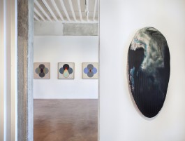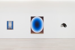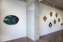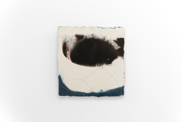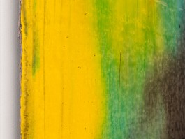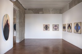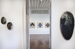 Using knowledge of materials acquired when building a house on the edge of the Peak District (part of a strategic determination to make money in a time of economic gloom), and with allusion to Renaissance frescos and Indian reverse glass painting, he has devised an alchemical process whereby plaster, polymer and pigment are combined and shaped into a low-lying, elongated oval. Once dry, the works are turned over to reveal the workings of the pigment.