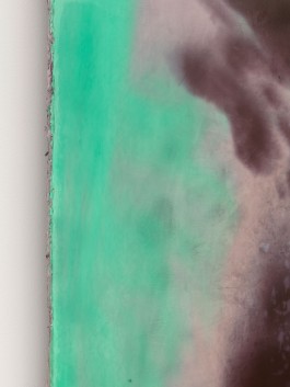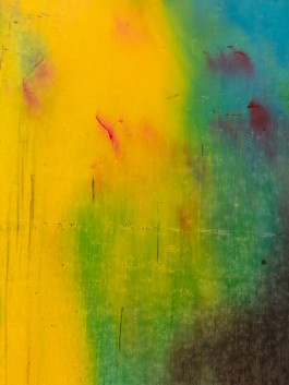 Jessica Warboys’ paintings are a result of the harnessing of the independent force of nature, in that they are made mainly by placing canvas in the sea. Direction, hands free, is never just one way, as the visual result and surrounding narrative dissolves a rhythm of autonomous and independent logic. The result, anything but pictorial or determined, manages to convey a sense of diffuse powerlessness. It is a matter of throwing yourself in, metaphorically, as the vison appears, against a sub plot of expectation about what a painting should actually do. A production of non-centralised, all-over activity; the movement of water, like that harnessed for electricity, brings about a mass of image shown roughly across a structure.