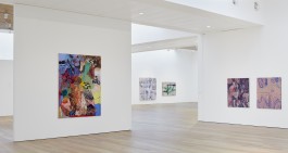 Made in a sort of ‘hands free’ manner the somewhat belligerent iconographic paintings by Harminder Judge, are as much a matter of relief as paint. As with the work of Reiter Raabe and Warboys, with imagery, in Judge’s case a splattering, or mass, of pigment suspended within its own physical volume, a swarm of flies caught in aspic, in an apparently indirect manner. The subject and direction is petrified within a build-up of material and the work functions in a back to front manner, with the work reflecting gestural movement. The iconic, shift, rivulet of action, put in from behind or on top, arrives fixed and finite and front of stage, as it were, with hard surface, and diffuse action held still. The gesture is suspended, frozen in time, when turned from upside down and around to face us. So, like the director of an opera, the artist achieves total revelation only after the curtain has lifted at the dress rehearsal. Made up of many gestures and moments, after copious process and care, the instant breath or cross section of reaction is revealed with colour making up an image delivered all at once. Works by Judge allude to the gesture of expressionism but also to a statement that comes, perhaps, from elsewhere. Loose powdery material leaves a trace, like a script or language of painterly ambition. Like Reiter Raabe, who paints from above, neither artist is in a position to stand back, as it were, and choose what they have made. With trust in the process, something has landed.