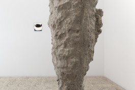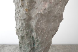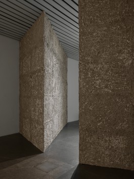 Cliff and Cleft also features two new sculptural works. Untitled (rock risen cleft cliff) almost covers the floor of the top mezzanine level. It is craggy and organic in shape, appearing like a natural slab of rock, though formed from the same plaster as Judge’s wall-hung pieces. A five-centimetre gap divides the work and the walls, rendering it in an in-between state, as both a walkable floor surface and independent sculpture. Likewise, Judge’s mercurial treatment of his material throughout the exhibition reflects upon the alchemical potential of many items in this world – including the human body. This connects with Judge’s ongoing interests in the transition of the body from it physical fleshy form into ash upon death and ceremonial burning. Untitled (rock risen cleft) is a tall sculpture which reflects upon the coffin-like piece originally shown in Judge’s Sunday Painter installation. This new work stands on one end, with a thick line traversing its length from top to bottom. It is totemic in feel, carved symmetrically on either side of the dividing line, mirroring the centre point that runs through his larger wall-hung works. This piece could be read as bodily in its shape and form, while also veering between the appearance of natural rock, paleolithic carving, and pagan figure.