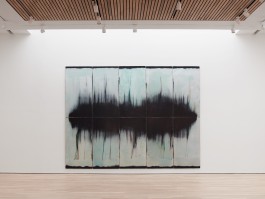 Jessica Warboys’ paintings are a result of the harnessing of the independent force of nature, in that they are made mainly by placing canvas in the sea. Direction, hands free, is never just one way, as the visual result and surrounding narrative dissolves a rhythm of autonomous and independent logic. The result, anything but pictorial or determined, manages to convey a sense of diffuse powerlessness. It is a matter of throwing yourself in, metaphorically, as the vison appears, against a sub plot of expectation about what a painting should actually do. A production of non-centralised, all-over activity; the movement of water, like that harnessed for electricity, brings about a mass of image shown roughly across a structure.