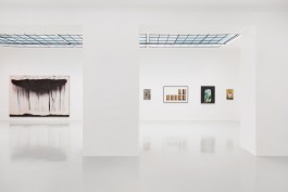 Made in a sort of ‘hands free’ manner the somewhat belligerent iconographic paintings by Harminder Judge, are as much a matter of relief as paint. As with the work of Reiter Raabe and Warboys, with imagery, in Judge’s case a splattering, or mass, of pigment suspended within its own physical volume, a swarm of flies caught in aspic, in an apparently indirect manner. The subject and direction is petrified within a build-up of material and the work functions in a back to front manner, with the work reflecting gestural movement. The iconic, shift, rivulet of action, put in from behind or on top, arrives fixed and finite and front of stage, as it were, with hard surface, and diffuse action held still. The gesture is suspended, frozen in time, when turned from upside down and around to face us. So, like the director of an opera, the artist achieves total revelation only after the curtain has lifted at the dress rehearsal. Made up of many gestures and moments, after copious process and care, the instant breath or cross section of reaction is revealed with colour making up an image delivered all at once. Works by Judge allude to the gesture of expressionism but also to a statement that comes, perhaps, from elsewhere. Loose powdery material leaves a trace, like a script or language of painterly ambition. Like Reiter Raabe, who paints from above, neither artist is in a position to stand back, as it were, and choose what they have made. With trust in the process, something has landed.
